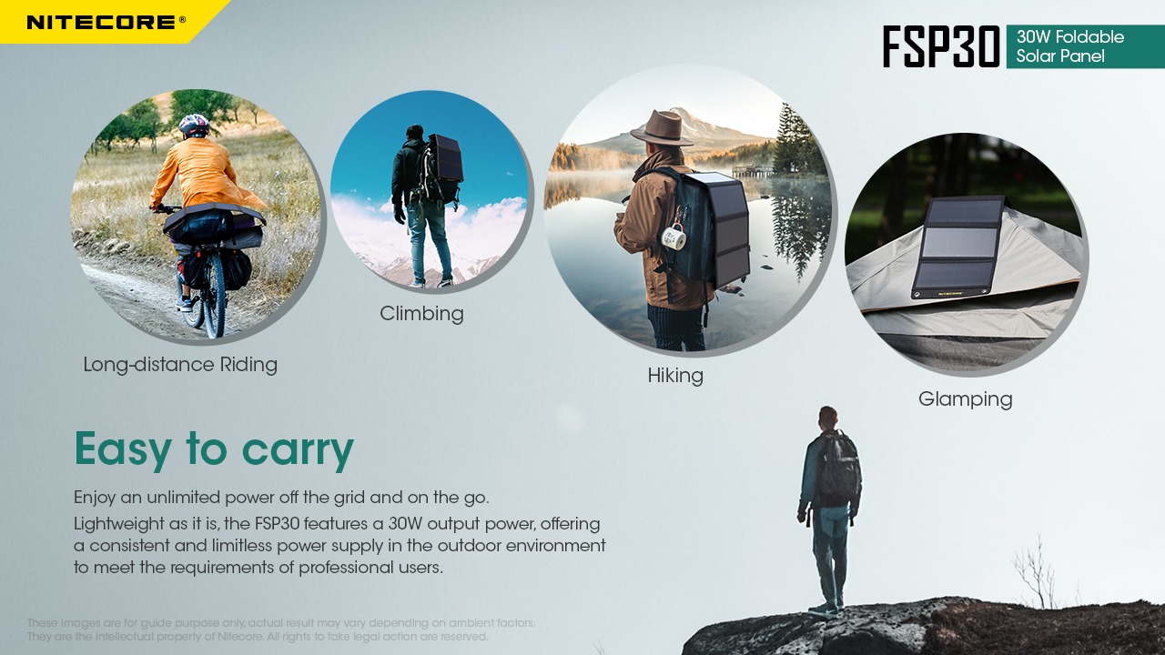 NITECORE FSP30 foldable solar panel features a light weight of 625g ,3 output ports with 30W max output power. It has an outstanding cell efficiency of 24% while 18W PD charging speed is available for the USB-C Port, which can provide an outdoor power supply for smartphones, tablets, headlamps etc